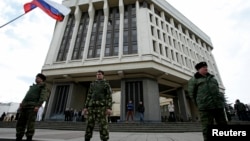 Сюди ж стали підтягуватися озброєні солдати російської армії на бойовій техніці. Тоді вони були без розпізнавальних знаків. Це давало підстави офіційній російській владі стверджувати, що так званими «ввічливими людьми» є представники «самооборони».