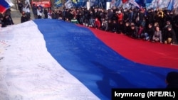 У Сімферополі біля кримського парламенту 16 березня розгорнули великий російський прапор з нагоди річниці від дня проведення в Криму невизнаного референдуму, після якого Росія включила півострів до свого складу.