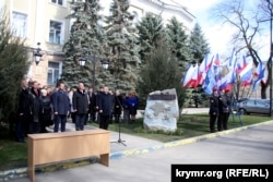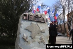 У Сімферополі на вулиці Горького в понеділок, 16 березня, встановили пам'ятний знак із зображенням кримського півострова і написом «Наш дім – Росія». Як повідомляє кореспондент Крим.Реалії, у заході взяли участь представники кримської влади.