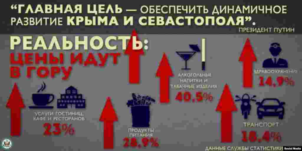 У перші дні анексії Криму російська пропаганда розповідала жителям півострова про прекрасне життя, яке на них чекає. Реальність виявилася більш жорстокою. Посольство США в Росії у своєму Twitter опублікувало серію інфографік про реальний стан справ у Криму.