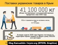 Зокрема, за даними Россільгоспнагляду, за місяць з материка поставили 19556,7 тонни овочів, 4603,7 тонни фруктів і горіхів, 651,4 тонни борошномельно-круп'яної продукції, 22 тонни зернових, 15,6 тонни бобових, 14,6 тонни олійних і 44,6 тонни інших товарів. Продуктів тваринного походження в травні поставили 16,2 тис. тонн, у живій вазі завезено 100 домашніх і 157 сільськогосподарських тварин. Крім того, завезли 8,5 млн штук курячих яєць.