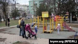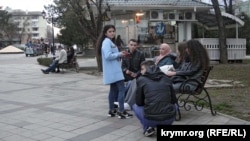 Молодь (серед них є і кримські татари, судячи з хіджабів на дівчатах) чинно розмовляє.