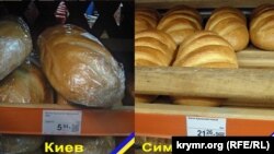 Фотографії прилавків з продуктами та цінами розташовані поруч, ліворуч – супермаркет у Києві, праворуч – у Сімферополі. Щоб не було помилок, фотографії підписані і помічені кольорами прапорів України та Криму.