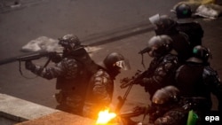 Протестувальники біля палаючих барикад на майдані Незалежності. Київ, 19 лютого 2015 року