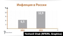 Не відстає у зростанні й інфляція: в 2015 році вона зросла майже в 2 рази в порівнянні з тим же «золотим» періодом, коли у Росії ще не було Криму. За підсумками 2013 року, рівень інфляції склав 6,6%, а в 2015-му ‒ вже 12,9%.