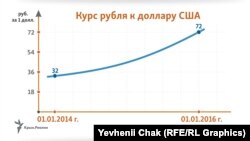 Курс рубля до долара США також впав в два рази: з 32 на початку 2014 року до 72 на початку 2016-го. Як підсумок, росіяни стали, щонайменше, в два рази біднішими. Але це не страшно, адже головне, що «Крим наш».