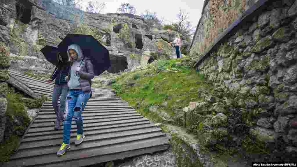 Вид на печери. Крім них у місті збереглися руїни мечеті, мавзолей, дві кенаси й одна житлова садиба