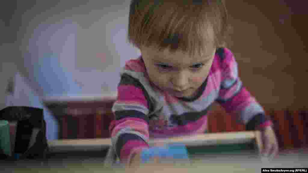 Аміра грається з жирафом, якого їй подарували члени організації «Наші діти» («Бізім балалар»), які взяли під тимчасову фінансову опіку дітей кримських політв'язнів і зниклих безвісти кримчан