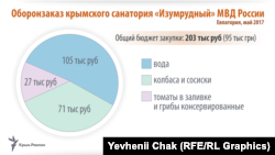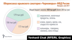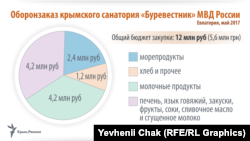 На кримському порталі держзакупівель ми знайшли низку оголошень від кримських санаторіїв, які в результаті «націоналізації» тепер контролюються Міністерством внутрішніх справ Росії і ФСБ. Для них в рамках оборонзамовлення планується закупити продуктів харчування на суму понад 10 мільйонів російських рублів (4,7 мільйона гривень). У тендерній документації зазначено і те, чим в цих санаторіях мають намір годувати силовиків та членів їхніх сімей.