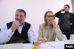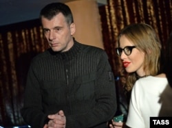 Висування Ксенії Собчак в президенти часто порівнюють з походом у політику бізнесмена Михайла Прохорова. Його теж називали «спойлером» і «спаринг-партнером» Володимира Путіна на виборах 2012 року. На цьому фото, зробленому 15 грудня 2013 року, Собчак і Прохоров зображені на прем'єрі фільму «Швидше, ніж кролики» в кінотеатрі «Жовтень».