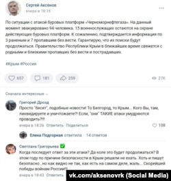 «Сьогодні вранці ворог завдав удару по бурових платформах «Чорноморнафтогазу». Перебуваю на зв'язку з колегами з Міноборони та ФСБ, працюємо над порятунком людей. Врятовано 5 людей, троє з них поранені. Пошуки решти тривають», – написав на своїх сторінках у соцмережах підконтрольний Кремлю глава Криму Сергій Аксьонов (за документами – Аксенов).