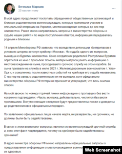 «У нас є прізвища і дати народження 15 людей, які зникли безвісти. Я знаю зі слів свого сина приблизно сроковиків, яких бачив він на кораблі. Ці дані ніде публікуватися не будуть. Ще раз повторю: нікому ці дані не будуть передаватися до того, поки ми не отримаємо офіційні відповіді від ЧФ та військової прокуратури. Або якщо з нами почнуть працювати, – написав Дмитро Шкребець.