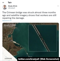 Міст через Керченську протоку досі не відновлений, стверджує аналітик відділу досліджень зовнішньої та оборонної політики Американського інституту підприємництва Бреді Африк. Таких висновків він дійшов, аналізуючи супутникові знімки мосту, зроблені на початку січня 2023 року.