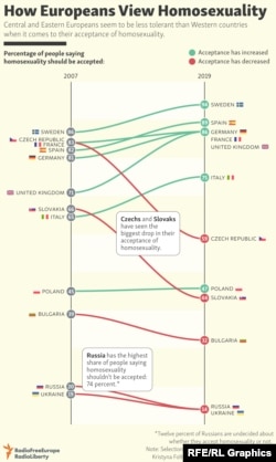 – Я знаю про це дослідження, і воно мене дещо здивувало – і не результати щодо України та Росії, а я звернув увагу на результати щодо Чехії. Там, згідно з цим дослідженням, погіршилося ставлення до гомосексуальності з 2007-го із 83% до 59%, але переді мною також є дослідження Pew research center нещодавнє про одностатеві шлюби, і там вказано, що у Чехії їх підтримують 65%. Оця різниця між тими, хто приймає гомосексуальність, і тими, хто підтримує одностатеві шлюби, є досить великою, і її не можна пояснити статистичною помилкою, тож я думаю, що багато що в таких дослідженнях залежить від методики і того, як сформульовано запитання. Я б дуже обережно до цього всього ставилося.