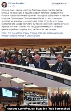Депутат Держдуми Росії від анексованого Криму Руслан Бальбек не виступав і не робив ніяких заяв на Форумі ООН із питань прав людини, демократії та верховенства права в Женеві. Про це повідомила Крим.Реалії перший заступник міністра інформаційної політики України Еміне Джеппар.