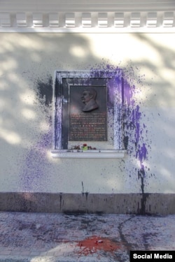 У Сімферополі в ніч з 17 на 18 травня невідомі залили синьою фарбою меморіальну дошку Йосипу Сталіну на стіні будівлі офісу Кримського відділення КПРФ по вул. Долгоруковській.