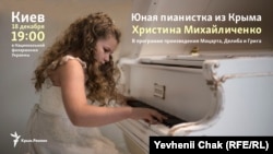 Кримська піаністка Христина Михайліченко виступить із великим концертом у Національній філармонії України в Києві. У програмі – твори Моцарта, Деліба і Гріга. Концерт відбудеться в неділю 18 грудня о 19:00.