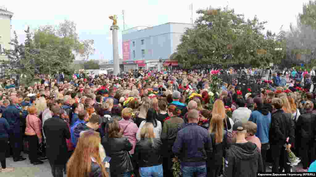 На площі Леніна стоять у ряд 17 закритих трун із тілами жертв трагедії. Поряд із кожним із них – фотографії й таблички з іменами загиблих. Грає жалобна музика. На великому екрані зображена свічка й напис «Керчь 17.10.2018»