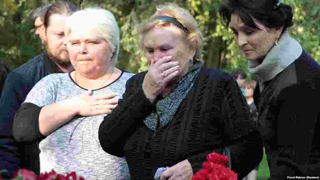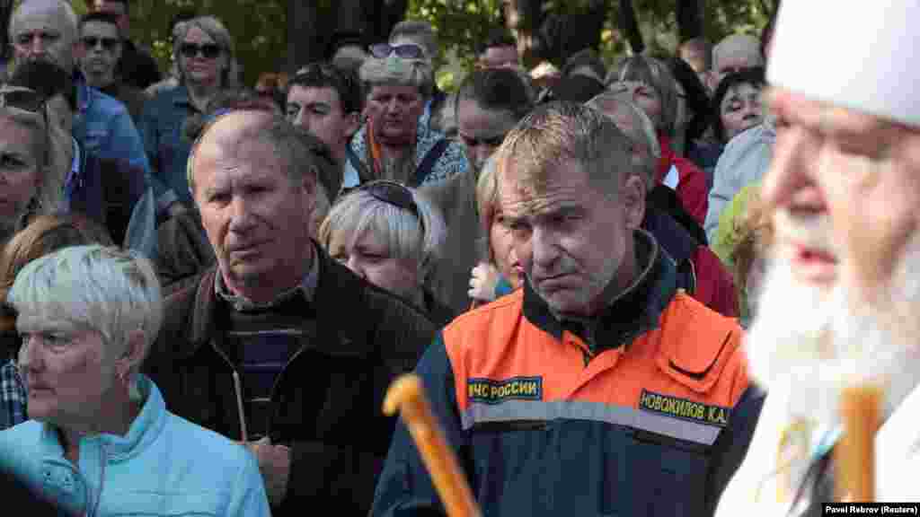 У Керчі близько сотні людей зібралися на молебень за загиблими в результаті масового вбивства в Керченському політехнічному коледжі. Поруч із навчальним закладом встановили імпровізований меморіал – чорне полотно з фотографіями свічок і написом «сумуємо». З самого ранку туди сходяться люди – несуть квіти, свічки та м'які іграшки. Там же церковнослужителі читають літургійний молебень за загиблими.