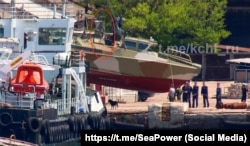 Через три тижні після потоплення українськими військовими росіяни підняли з дна біля Зміїного два катери типу «Раптор». На фото під час вивантаження катера в Севастополі на одному з катерів видно пробоїну від влучання снаряда.