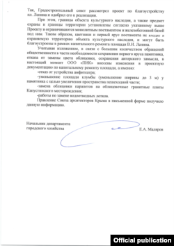 «Межі об'єкта культурної спадщини, а також предмет охорони (пам'ятник Леніну ‒ КР) встановлені згідно з проєктом і обмежуються монолітним постаментом та залізобетонною базою під ним. Таким чином, квітники та перший ярус постаменту не входять до охоронюваної території об'єкта культурної спадщини та можуть бути впорядковані в межах капітального ремонту площі Леніна», ‒ повідомляє начальник департаменту міського господарства російської адміністрації Сімферополя Євген Маляров.
