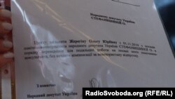На підтвердження цього вона продемонструвала Радіо Свобода депутатське звернення своєї колеги по парламенту – членкині фракції «Слуга народу» Анастасії Красносільської, – датоване 31 жовтня 2019 року.