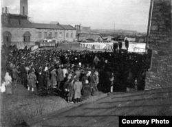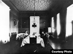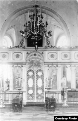 Внутрішнє оздоблення першої церкви Юзівки ‒ Преображенської. Після того, як її розширили, добудували дзвіницю, чотири бані та трапезну, вона стала Свято-Преображенським собором (не плутати з однойменним собором на території сучасного Донецька, що збудований в іншому місці та не схожий на оригінал). Церква була зведена 1886-го року на гроші місцевого поміщика Павла Лівена (в якого Новоросійське товариство взяло в оренду землю для заводів), власне самого Новоросійського товариства, жителів Юзівки та робітників, які жертвували на споруду із заробітку. Все, що ви бачите на фото, більшовики забрали 1922-го року ‒ заради «допомоги голодуючим». 1930-го вони ж заради «цінних кольорових металів» зняли із будівлі дзвони, а вже наступного року, заявивши про гостру потребу в будматеріалах, собор підірвали.