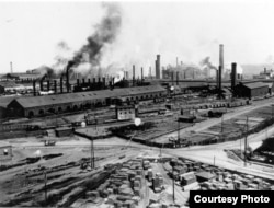 «Сталінська індустріалізація» Донбасу ‒ радянський міф: промисловість Юзівки була створена англійськими поселенцями, яку більшовики «націоналізували» та модернізували. Валійці електрифікували селище, проклали залізницю, що з'єднала заводи Юза із Харковом та Курськом, і звели заводи. На фото ‒ металургійний завод Новоросійської компанії з боку шахти «Заводська» із щойно привезеними із Англії конверторними печима та домнами. Перший чавун тут виплавили вже за три роки після початку будівництва заводу, у січні 1872-го року. Зараз на цьому місці розташований Донецький металургійний завод, майже у самому центрі сучасного Донецька.
